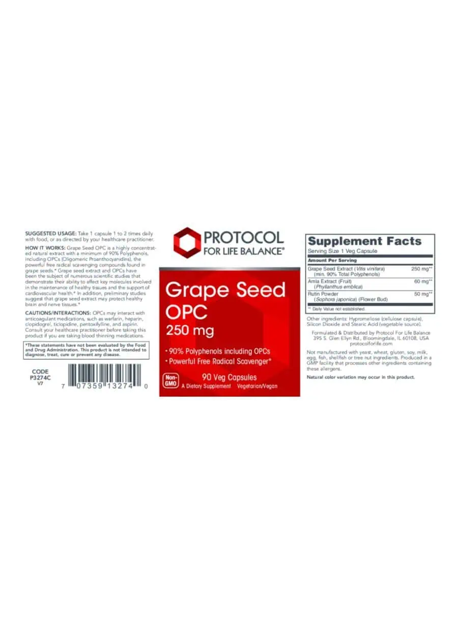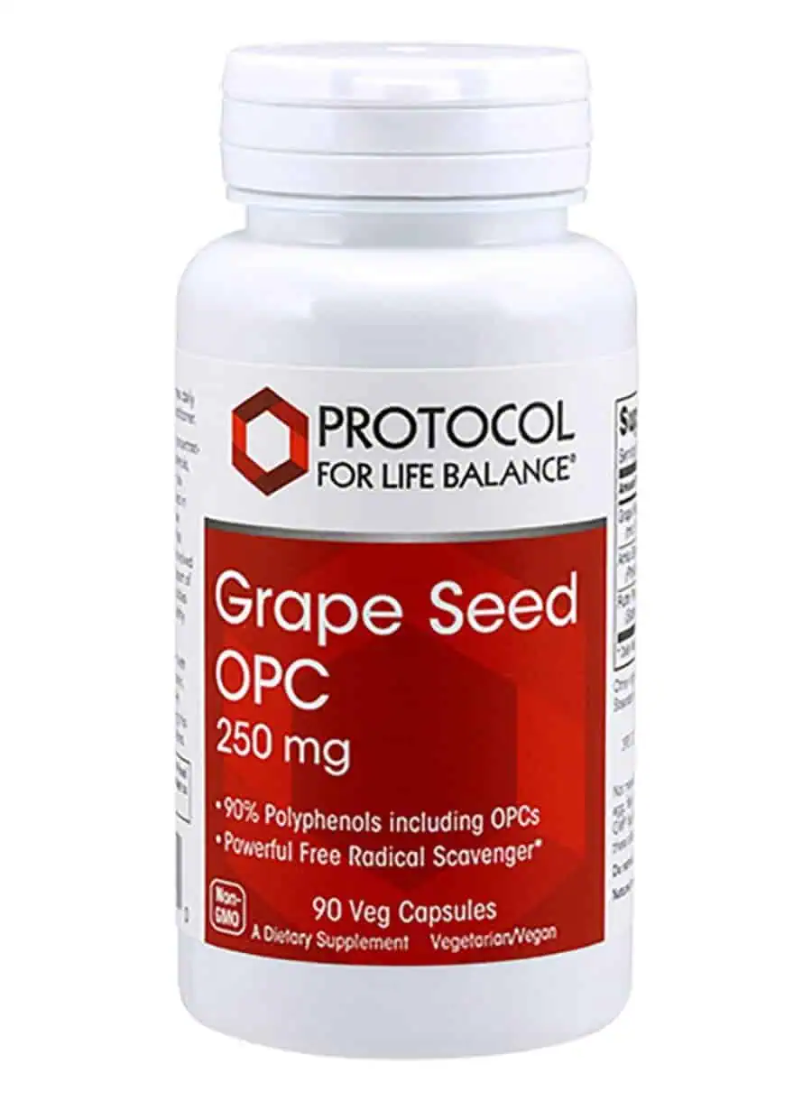 Grape Seed OPC 250mg — This highly concentrated natural extract contains a minimum of 90% Polyphenols, including OPCs (Oligomeric Proanthocyanidins), which are beneficial antioxidant compounds found in grape seeds. It supports cardiovascular health and immune system balance, making it an excellent choice for those looking to enhance their overall wellness. Additionally, Grape Seed Extract may protect healthy brain and nerve tissues.