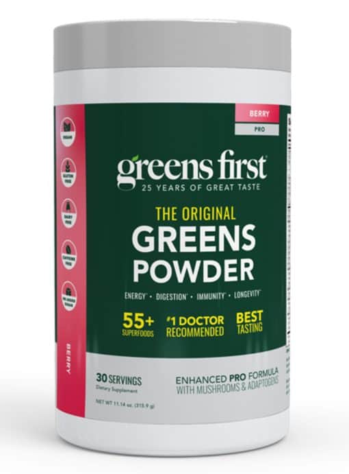 Greens First Berry Pro contains 54 different super foods, extracts and concentrates, including fruits, vegetables, probiotics, soluble fiber, natural flavonoids and digestive enzymes. Greens First Berry Pro superfoods are first juiced, then naturally spray dried without solvents at low temperature, leaving all the important nutrients intact. Greens First Berry Pro contains no yeast, corn, wheat, soy, dairy, egg, MSG, preservatives, artificial color or flavor, gluten, and is non-GMO.