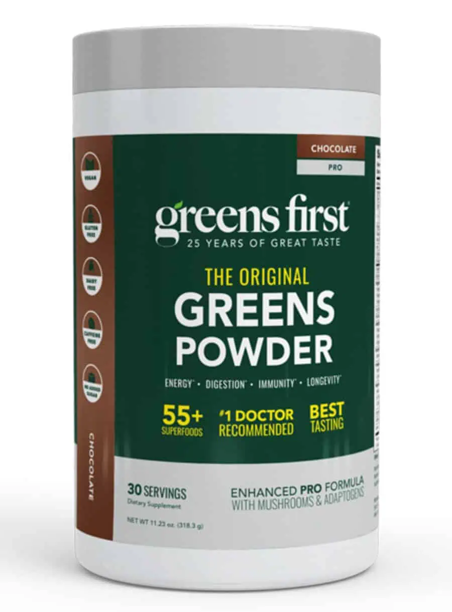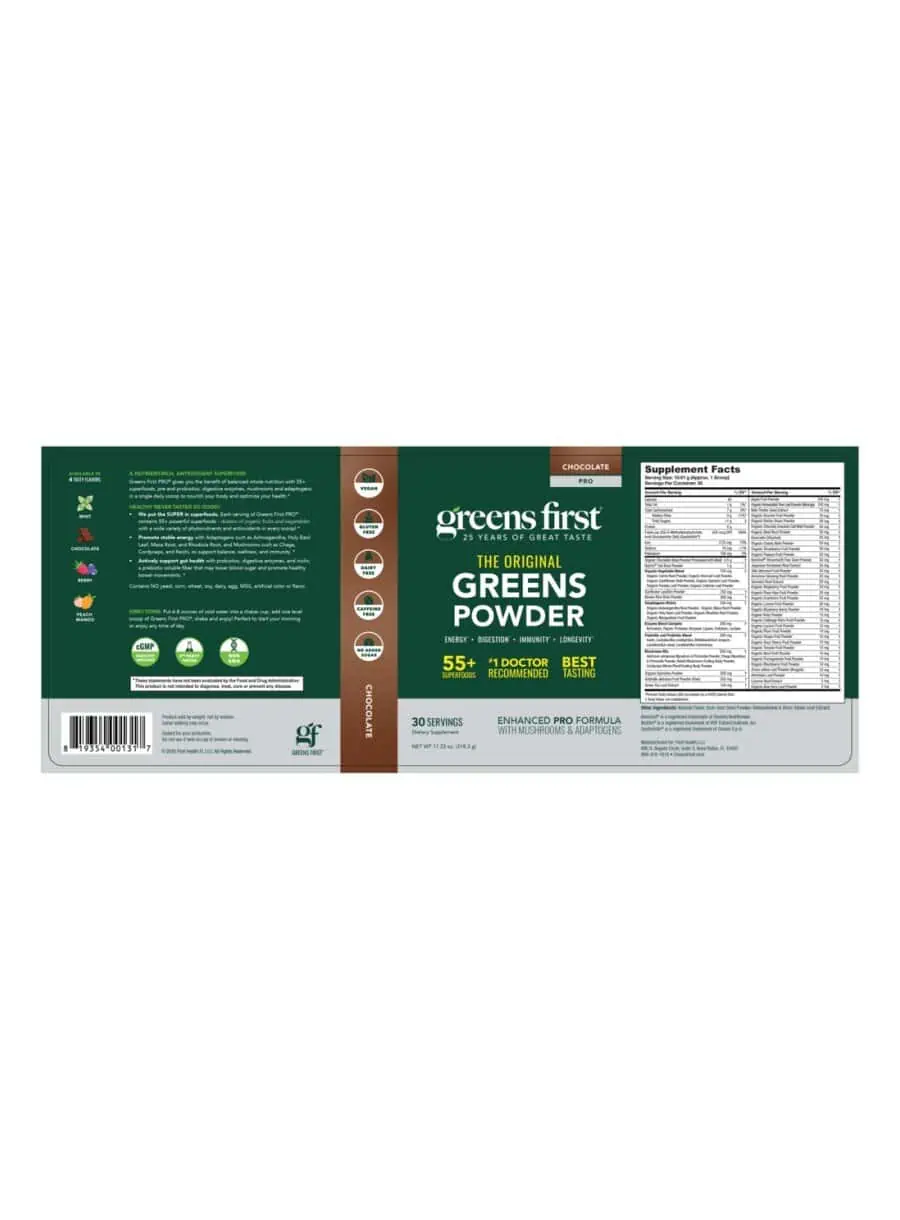 Greens First PRO (Chocolate) 400g — This chocolate superfood powder delivers a broad-spectrum blend of phytonutrient antioxidants, fruits, vegetables, enzymes, and probiotics in a convenient daily scoop. Designed for adults seeking an easy greens drink, it combines 54 different super foods with plant-based nutrition support in a great-tasting chocolate format. Ideal for daily wellness routines, especially for those looking to add more antioxidant-rich ingredients and digestive support to their diet.