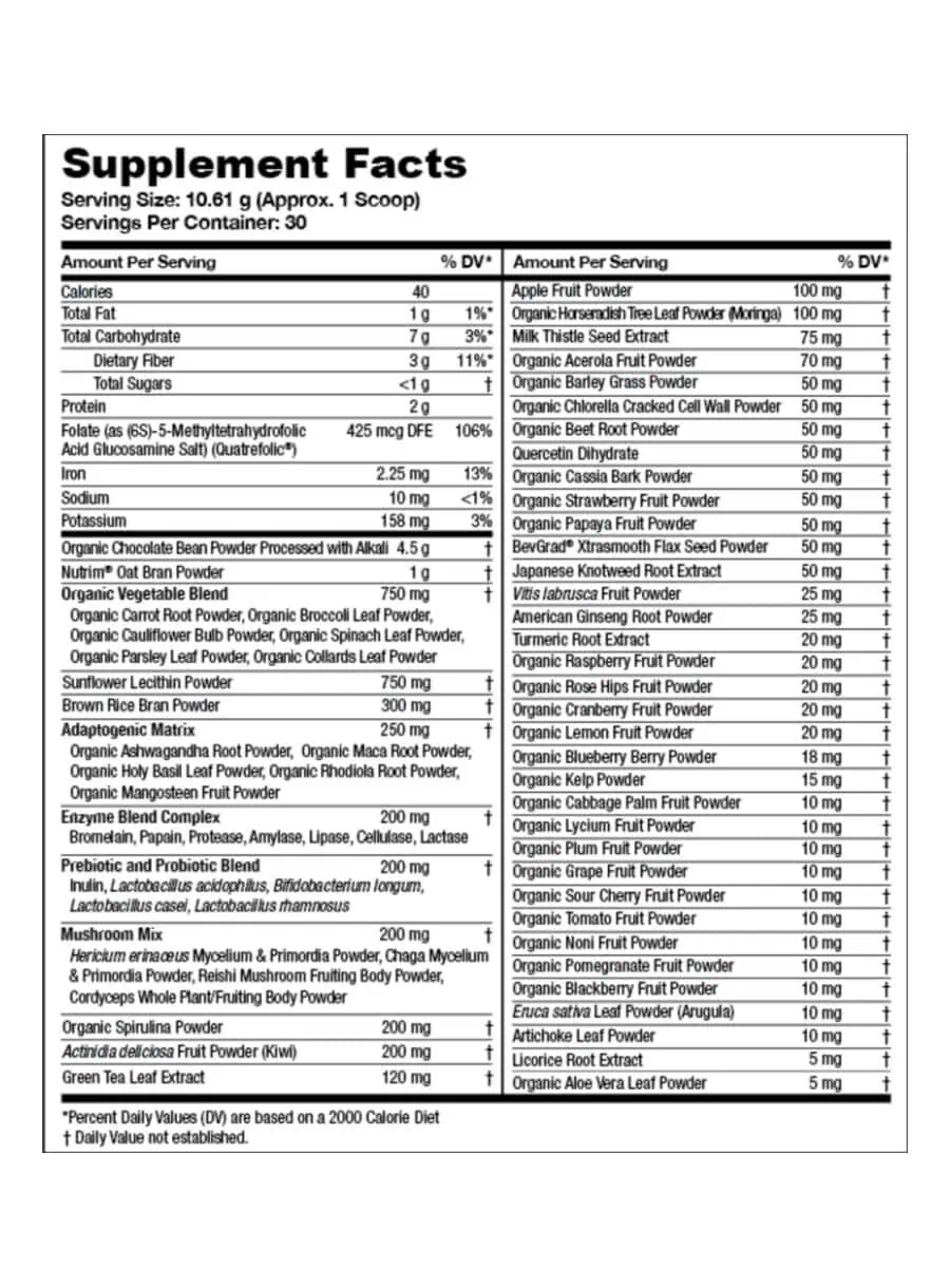 This multi-ingredient formula combines greens, fruit powders, antioxidant compounds, enzymes, and probiotic strains to support everyday nutrition and digestive wellness as part of a balanced lifestyle.