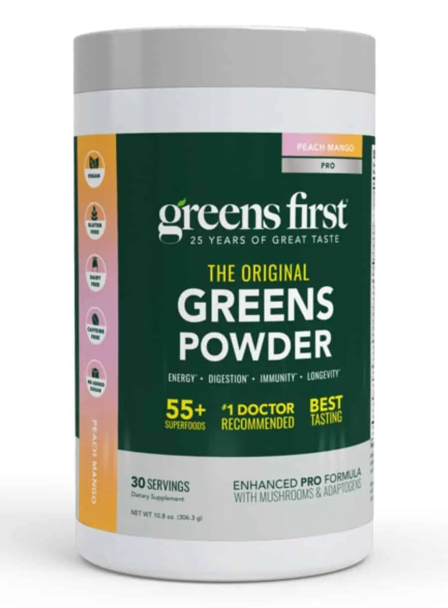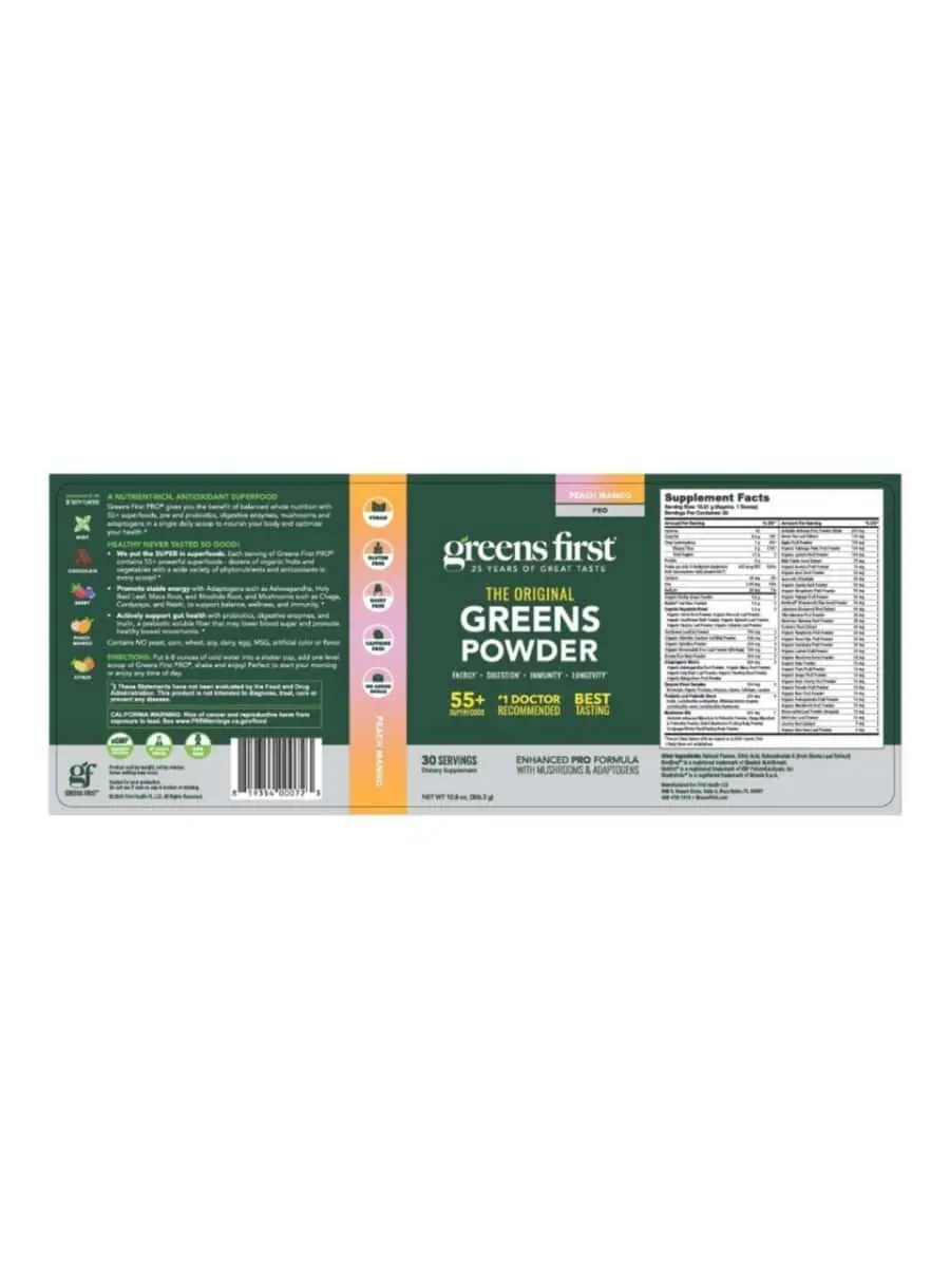 Greens First PRO Peach Mango is a nutrient-dense superfood blend featuring over 55 different organic fruits, vegetables, probiotics, and digestive enzymes. This delicious peach mango flavor is designed to support overall wellness, digestive health, and immune function. With no gluten, dairy, or artificial ingredients, it’s perfect for health-conscious individuals looking to enhance their daily nutrition.