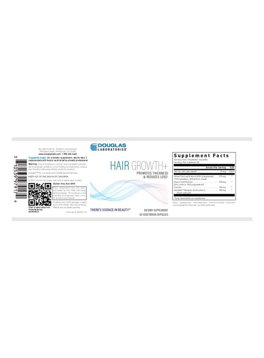 HAIR GROWTH+ by Douglas Laboratories is a specialized supplement designed to promote thickness and reduce hair loss. This formula features a clinically studied combination of grape seed and green tea polyphenols, zinc, and taurine, which work together to support the natural hair growth cycle and provide essential support for hair follicles. The unique blend of ingredients not only aids in promoting healthy hair growth but also enhances hair density and volume, making it an excellent choice for those looking to improve their hair health.