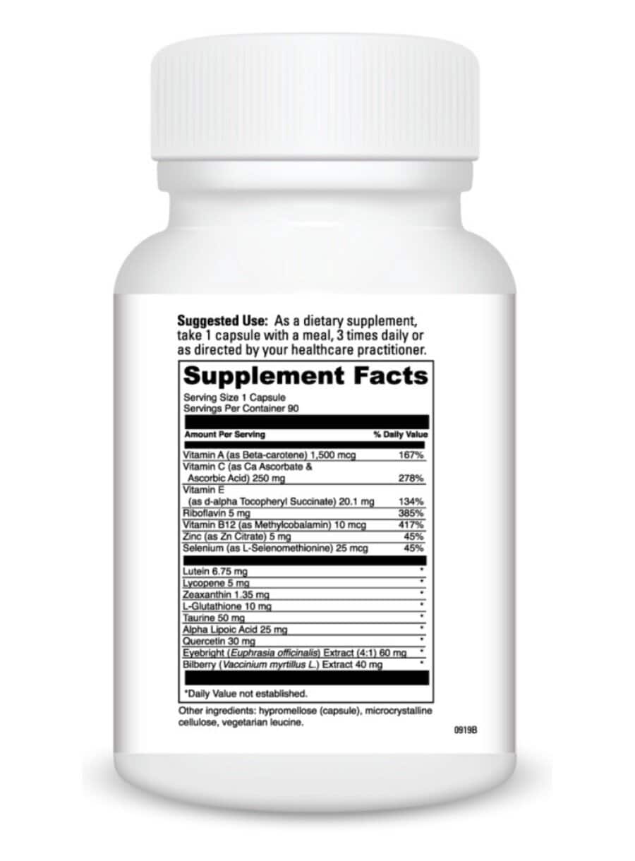 Healthy Eyes — is an advanced nutritional supplement designed to maintain ocular health that may decline as a result of dietary deficiencies, aging, toxins, free radical exposure, stress, and sunlight. The formula includes the antioxidants Alpha Lipoic Acid and Beta Carotene; Bilberry Extract, which contains bioflavonoids that support healthy histamine levels and helps remove materials from the retina; Eyebright, an herb that is used extensively for dry, irritated eyes, and eye strain; L-Glutathione and Lutein to help protect the lens from UV rays; Taurine, essential for maintaining the structural integrity of the retina; Quercetin and Rutin, antioxidants to support capillary strength; and Lycopene, a phytonutrient from tomatoes with antioxidant properties.