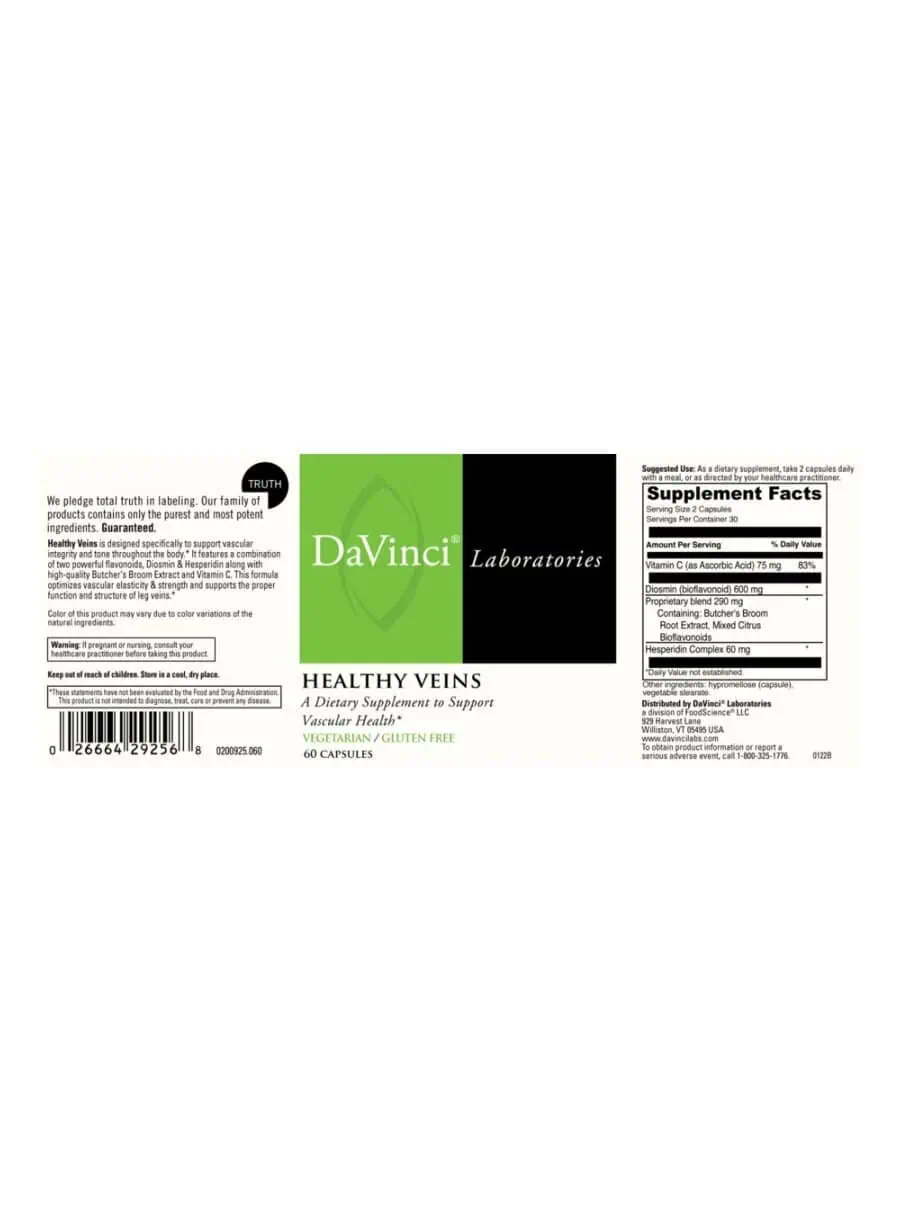 Healthy Veins — is designed specifically to support vascular integrity and tone throughout the body. It features a combination of two powerful flavonoids, Diosmin & Hesperidin (in a 10:1 ratio) along with high-quality Butchers Broom Extract and Vitamin C. This formula optimizes vascular elasticity & strength and supports the proper function and structure of leg veins.