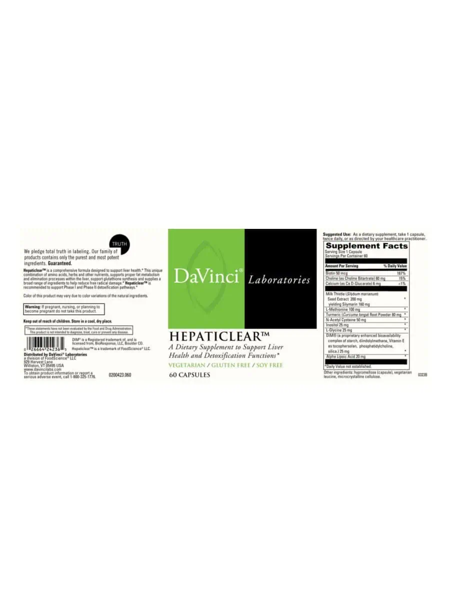 Hepaticlear — A dietary supplement to support liver health and detoxification functions. Hepaticlear is a comprehensive formula designed to support liver health when environmental toxins are present. This unique combination of amino acids, herbs, and other nutrients aids in fat metabolism within the liver, promotes glutathione synthesis, supports the safe elimination of toxins, and supplies a broad range of antioxidants to help reduce free radical damage. Hepaticlear is recommended to support Phase I and Phase II detoxification pathways.