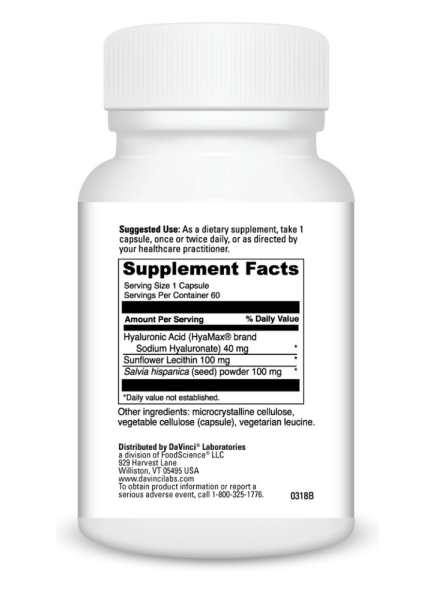 Hyaluronic Acid — A dietary supplement to support joint and connective tissue functions and skin health. H.A Capsules are designed to support healthy skin and joints by helping to hydrate, support healthy collagen, and thicken the synovial fluid. It combines low molecular (less than 30,000 daltons) weight hyaluronic acid with Chia and lecithin for maximum bioavailability. Hyaluronic Acid is an excellent adjunct to any program designed to support joint, skin and connective tissue health.
