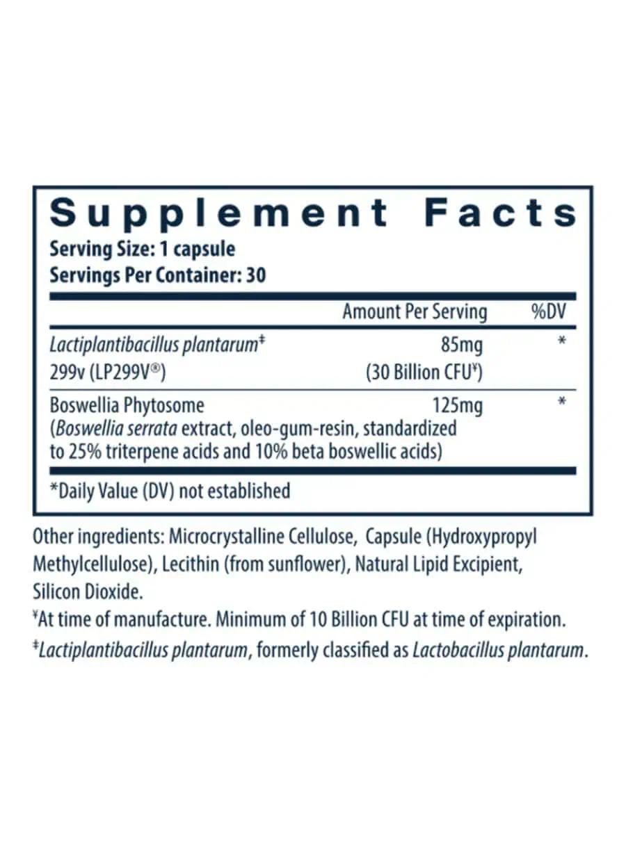 Crafted with precision to optimize effectiveness: Each capsule contains 30 billion CFUs of LP299V, the clinically effective dose and strain, combined with 125mg of highly bioavailable, lecithin-based Boswellia serrata extract in a clinically studied dose range.
