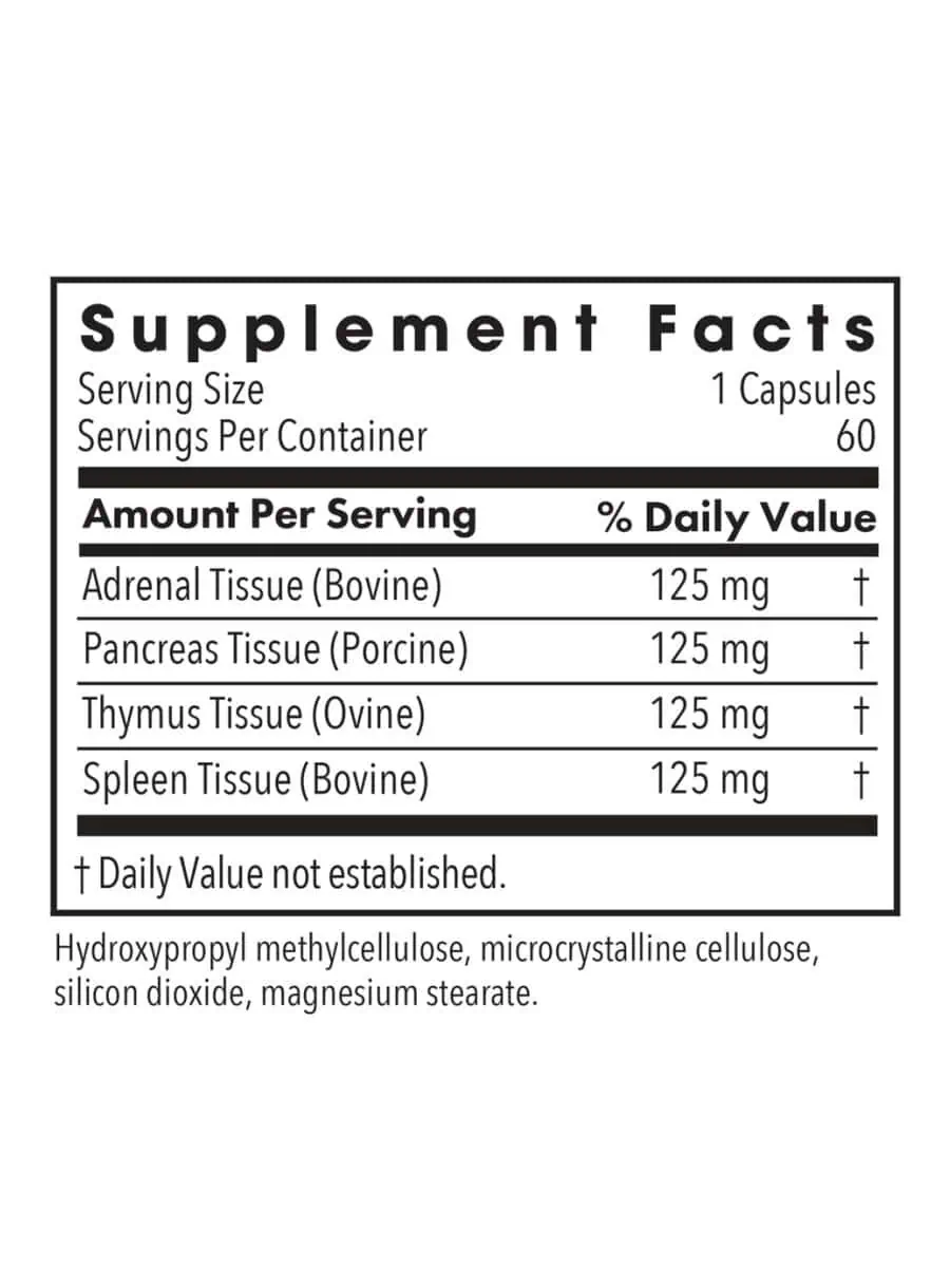 Immuno-Gland Plex — This multi-glandular immune support supplement features freeze-dried extracts from adrenal, pancreas, thymus, and spleen tissues. It is designed to support balanced immune responses and enhance systemic vitality, particularly beneficial during periods of stress or aging.