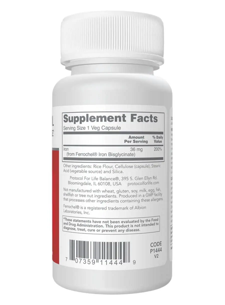 Iron 36mg — Iron is essential for the formation of hemoglobin, which carries oxygen to the body’s tissues, and myoglobin, which stores oxygen in muscle tissues. It plays a critical role in energy production and body temperature regulation, while also supporting immune system function and neurological health. This product features Ferrochel®, a highly bioavailable form of iron that is less likely to cause gastrointestinal distress or constipation.