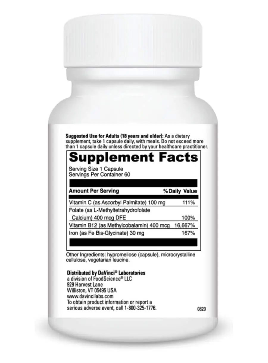This supplement features iron in the form of bis-glycinate, which is known for its superior absorption compared to other forms of iron. It also includes vitamin C, folate, and vitamin B12 to enhance overall efficacy.