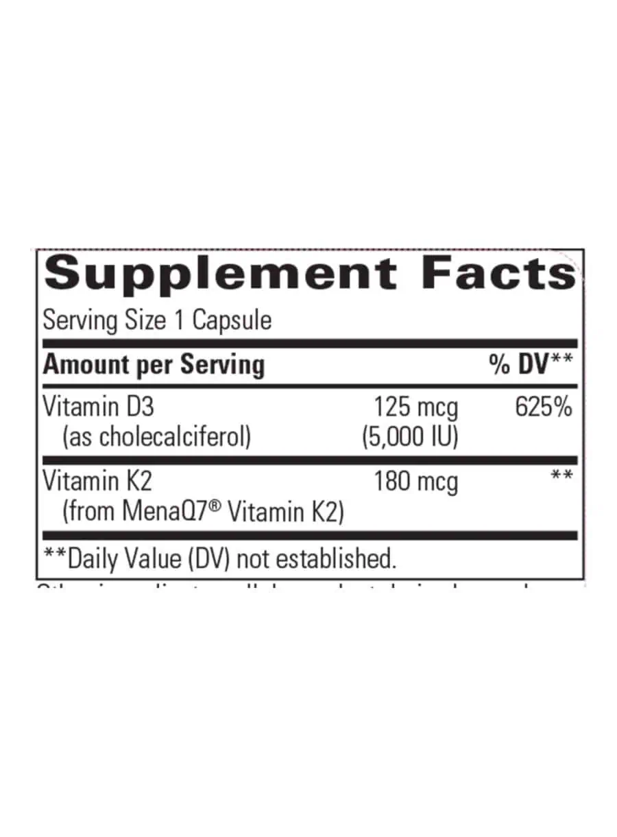 K2+D3 — This powerful supplement combines clinically studied MenaQ7® vitamin K2 with high potency vitamin D3 to provide essential cardiovascular and bone support. These two vitamins work synergistically to enhance calcium absorption and utilization, promoting healthy bones and cardiovascular function. Vitamin K2 plays a crucial role in directing calcium away from blood vessels and into the bones, thereby supporting optimal calcium deposition and overall bone health.