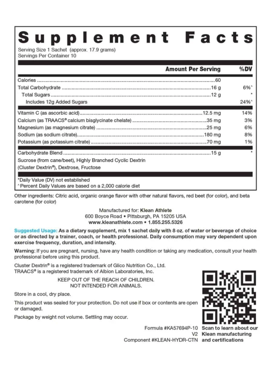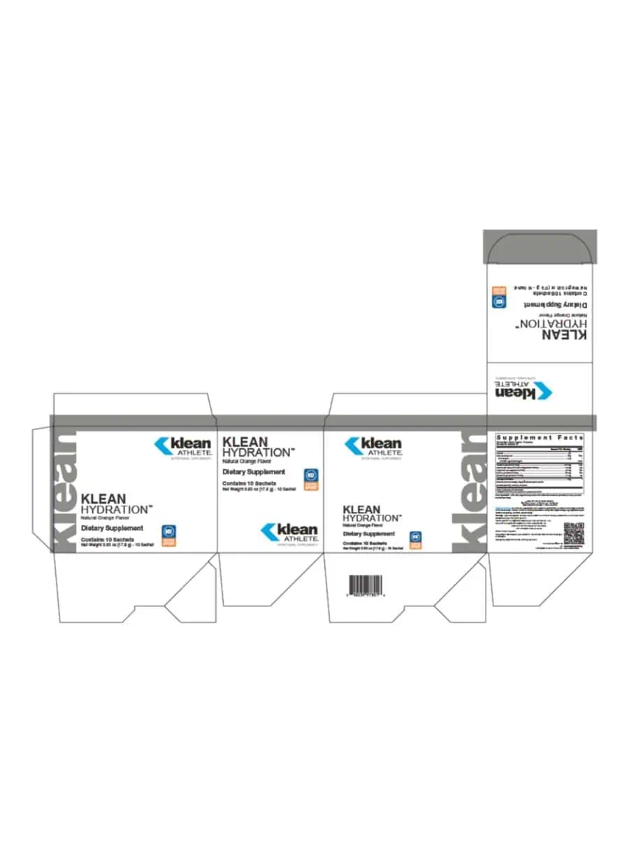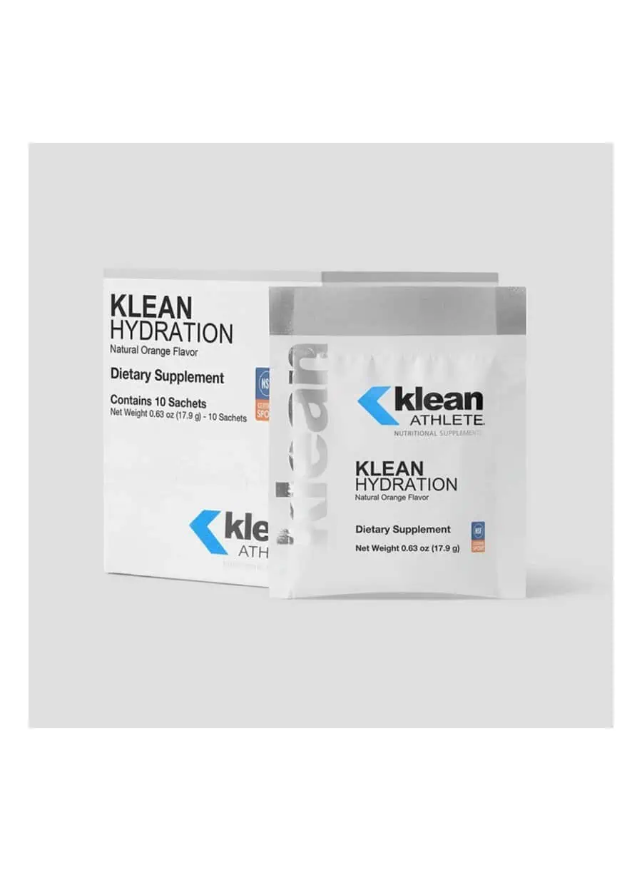 Klean Hydration Sachets — An athlete’s most important asset on game day, during training, or out on the race course is his/her engine. To perform at its best, the body requires adequate fluid and electrolyte intake before, during, and after exercise. Klean Hydration™ consists of 6% carbohydrates, including simple carbohydrates (glucose and fructose) and a complex carbohydrate (branched dextrin), along with additional minerals for fluid and electrolyte replacement during physical activity. The carbohydrates and sodium in this natural orange-flavored drink mix support the intestinal absorption of fluids to maximize hydration efficiency. Klean Hydration™ also has an osmotic concentration similar to that of body fluids, supporting fluid replenishment without slowing you down. Performing at your best through optimal hydration is simple with this great-tasting, naturally sweetened, and balanced hydration powder.