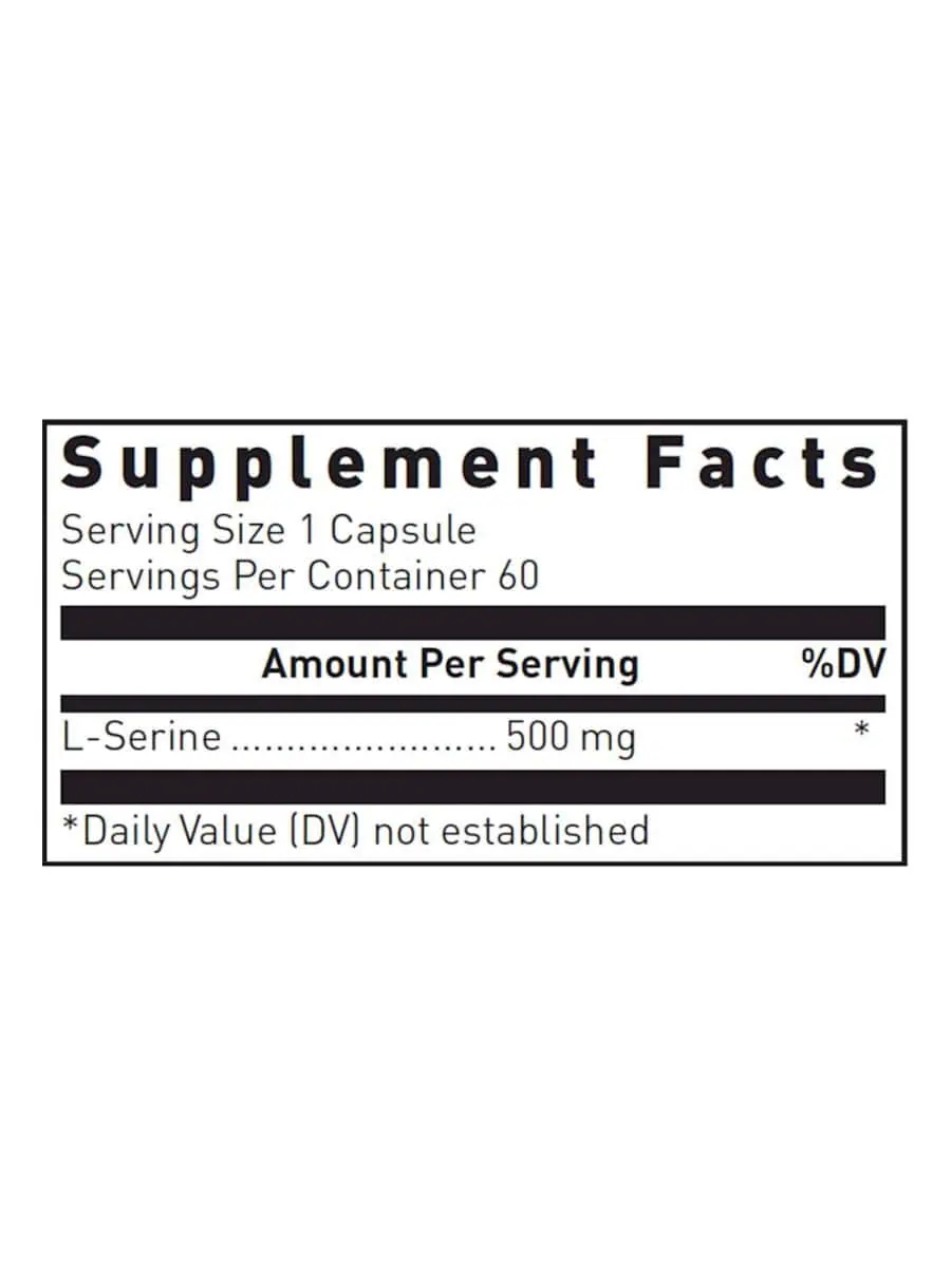 L-Serine 500mg — This dietary supplement provides 500 mg of the amino acid L-Serine in each capsule, supporting overall health and wellness. Ideal for adults, it is designed to be taken daily or as directed by a healthcare professional.
