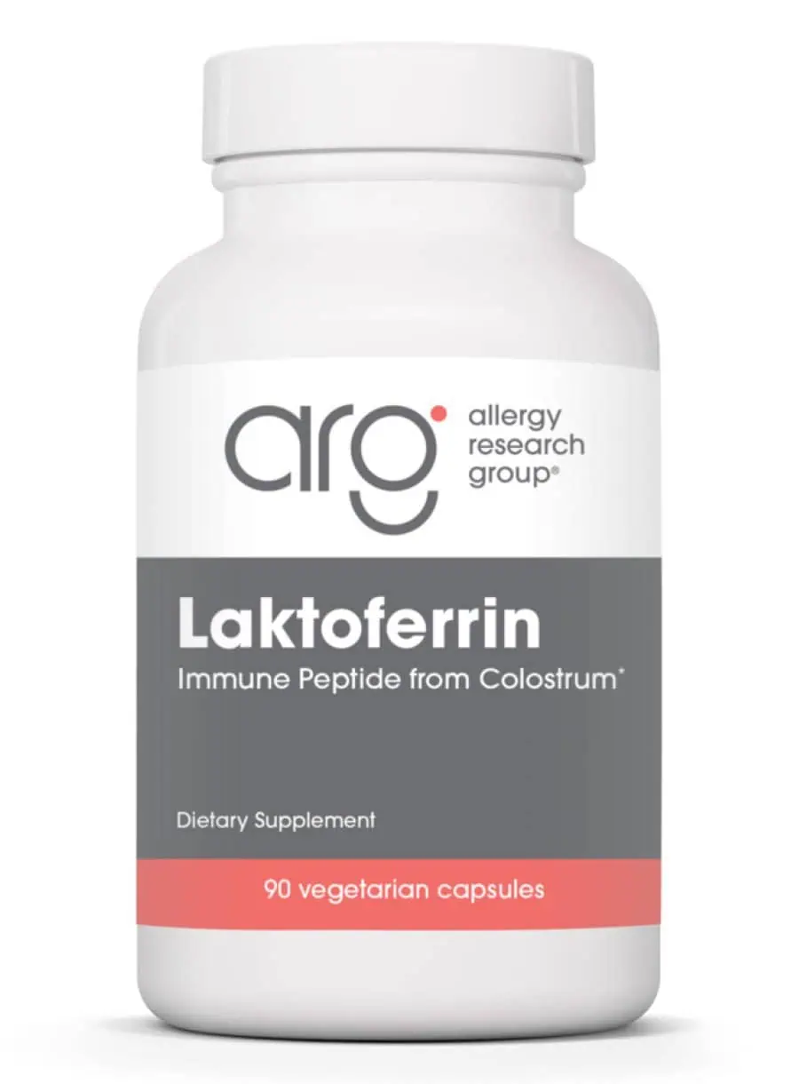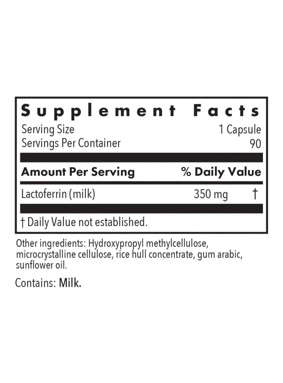 Laktoferrin 350mg — This dietary supplement provides lactoferrin, an immune peptide derived from bovine colostrum. It supports iron binding and transport while exhibiting antioxidant activity. Additionally, it may help deprive undesirable gastrointestinal microbes of the iron they need, and enhance and modulate immune activities.