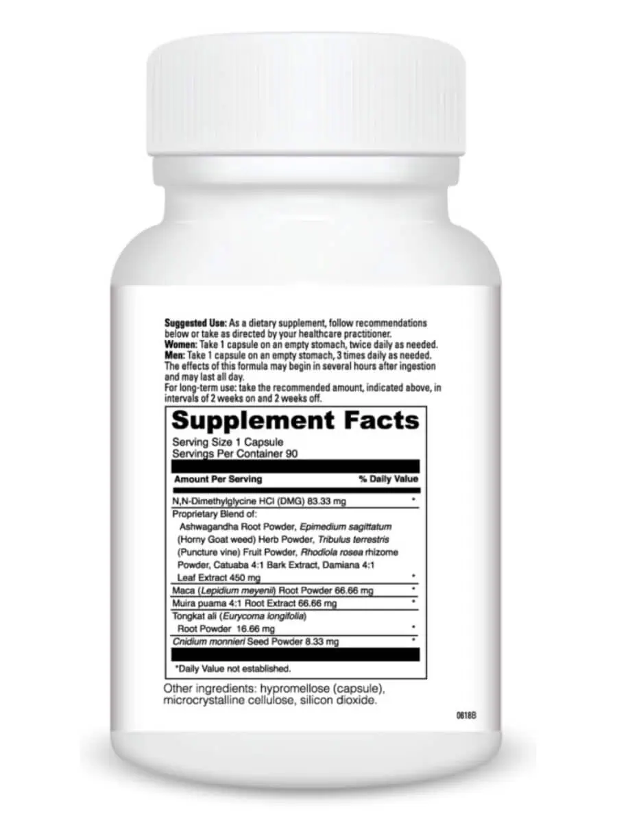 This formula includes a proprietary blend of herbs known for their traditional use in enhancing sexual health, combined with N, N-Dimethylglycine HCl (DMG) to support overall vitality.