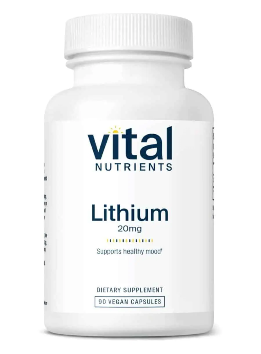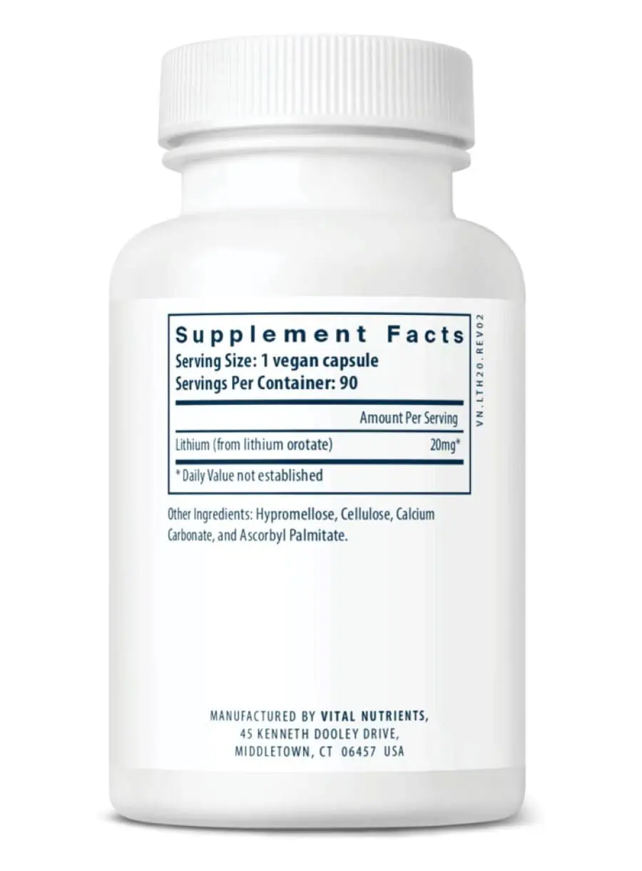 Lithium (orotate) 20mg — This premium vegan formulation supports healthy neurotransmitter activity and enhances the transport of Vitamin B12 and Folate into brain cells. It may promote mental and behavioral health while helping to resist the effects of stress.