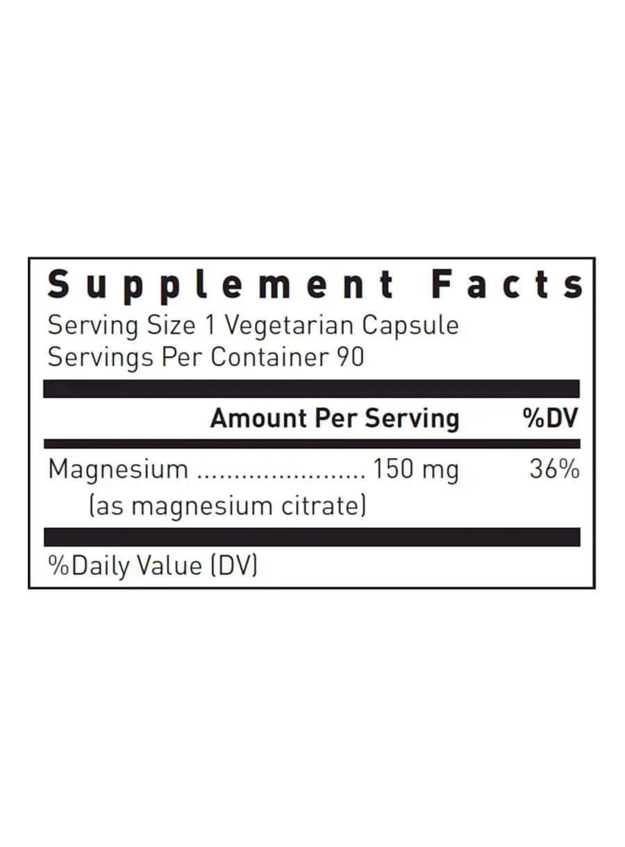 Magnesium Citrate — This supplement provides 150mg of elemental magnesium from bioavailable magnesium citrate in each convenient vegetarian capsule. Ideal for adults looking to support their magnesium levels, it is easy to incorporate into your daily routine.