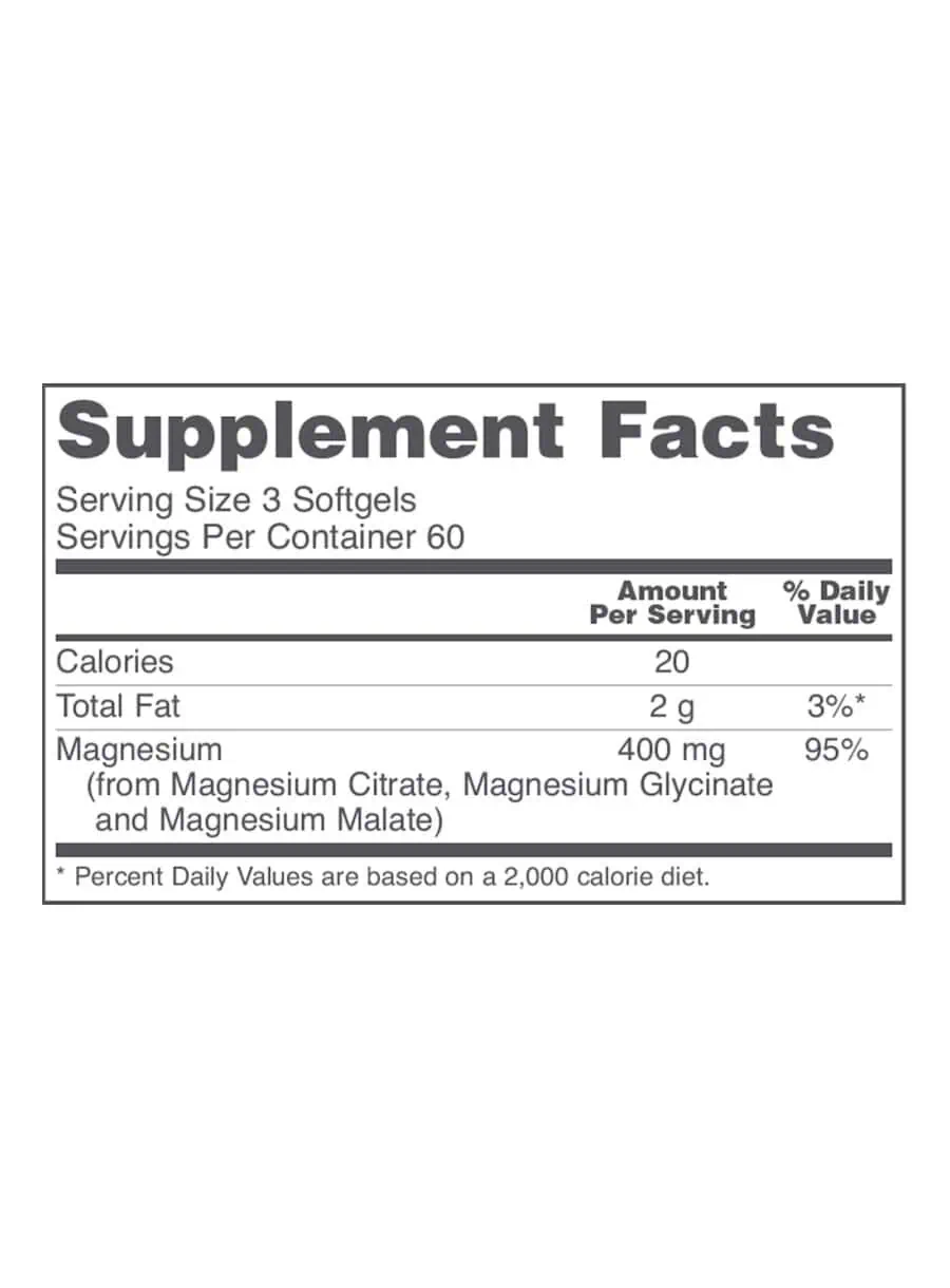 Magnesium Citrate Softgels — Magnesium is a vital mineral that supports the healthy function of every organ in the body. It plays a crucial role in energy production, metabolism, muscle contraction, nerve impulse transmission, and bone mineralization. This supplement combines easily absorbed Magnesium Citrate, Magnesium Glycinate, and Magnesium Malate in softgel form for superior bioavailability, making it an excellent choice for those seeking to enhance their magnesium intake.