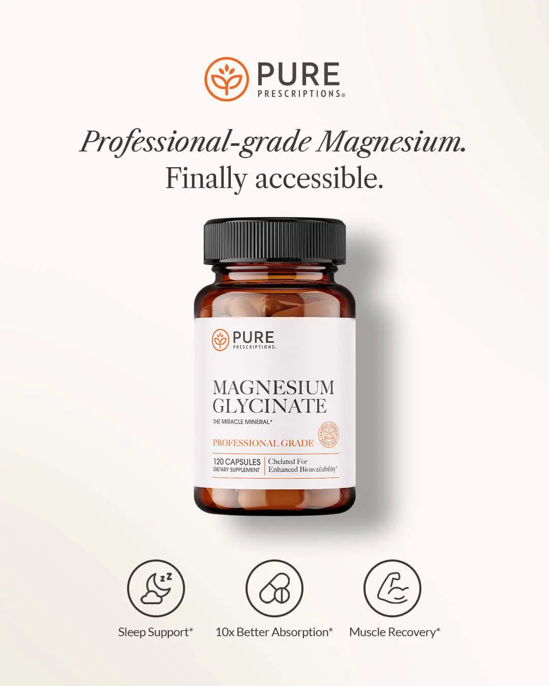 Pure Prescriptions Magnesium Glycinate is a mineral supplement that helps support a proper magnesium level in the blood. Additionally, this supplement can help in maintaining the normal functioning of cells, nerves, muscles, kidneys, bones and the heart, as well as normal ranges of blood pressure and energy, and in managing menstruation. While a proper diet will also aid in achieving these goals, regular usage of magnesium glycinate can provide the necessary dosage of magnesium to sustain the appropriate balance that the human body needs of this essential mineral.