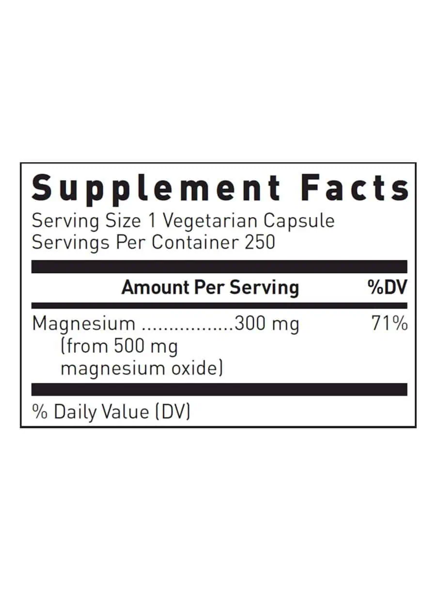 Magnesium Oxide — Each capsule provides 300 mg of elemental magnesium sourced from magnesium oxide, supporting essential physiological functions in the body. Many diets lack adequate magnesium, making supplementation vital for bridging this gap. Magnesium is crucial for over 300 enzymatic reactions, energy metabolism, and muscle function, while also playing a role in maintaining heart health and blood pressure.