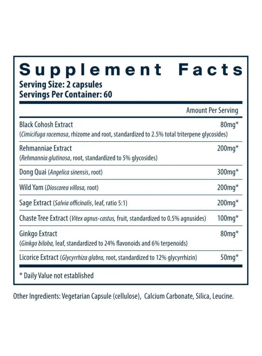 The formula contains a blend of herbal extracts, including Black Cohosh, Dong Quai, and Wild Yam, which are known for their supportive roles in hormonal balance and alleviating menopausal symptoms.