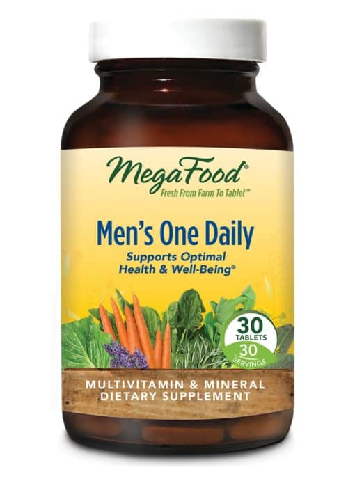Men’s One Daily — Specifically formulated without iron, this multivitamin supports the health and wellbeing of men. MegaFood® Men’s One Daily is designed to nourish the whole body and is gentle enough to take on an empty stomach. This convenient, once-daily tablet provides essential nutrients that promote healthy energy production, cardiovascular function, and nervous system health. With 400 IU (10 mcg) of FoodState® Vitamin D, it also supports mood and bone health, while zinc contributes to prostate health.