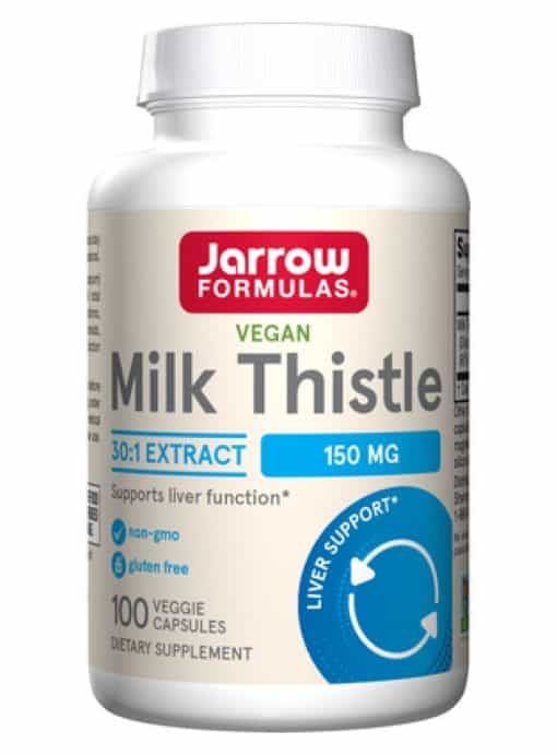 Milk Thistle — Jarrow Formulas® Milk Thistle (Silybum marianum) 30:1 extract is standardized to contain 80% total milk thistle flavonoids, including isosilybinins, silybinins, silychristin, and silydianin. This group of flavonoids, collectively known as silymarin, supports liver function by supporting glutathione levels. Each capsule delivers 150mg of this potent extract, making it an excellent choice for those looking to enhance their liver health.