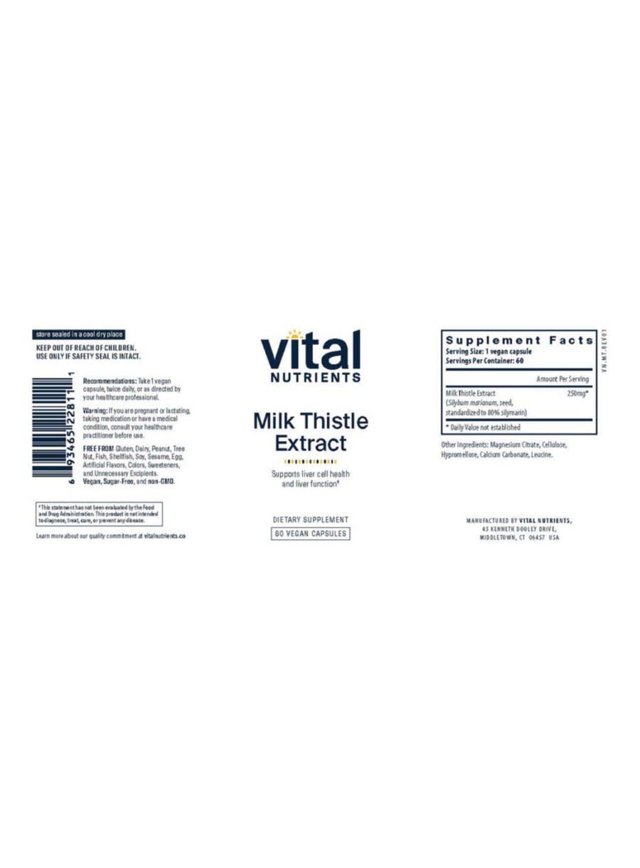 Milk Thistle Extract 250mg — This premium vegan formulation supports liver health by promoting detoxification processes and enhancing liver tissue. With its powerful antioxidant properties, Milk Thistle helps maintain healthy liver function and increases glutathione levels, making it an excellent choice for those looking to support their liver health.