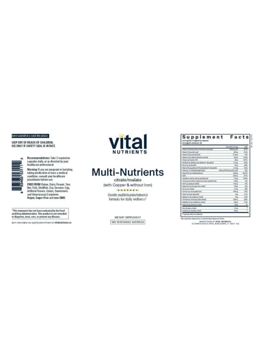 Multi-Nutrients Citrate/Malate (with Copper and without Iron) is a high potency multi-vitamin/mineral and trace element formula that provides the highest nutritional value for all systems of the body.* It is a bioavailable, gentle formula that is well tolerated by most individuals.* Multi-Nutrients Citrate/Malate (with Copper and without Iron) contains minerals in citrate/malate form for better absorption.* This formula contains copper and does not contain iron.