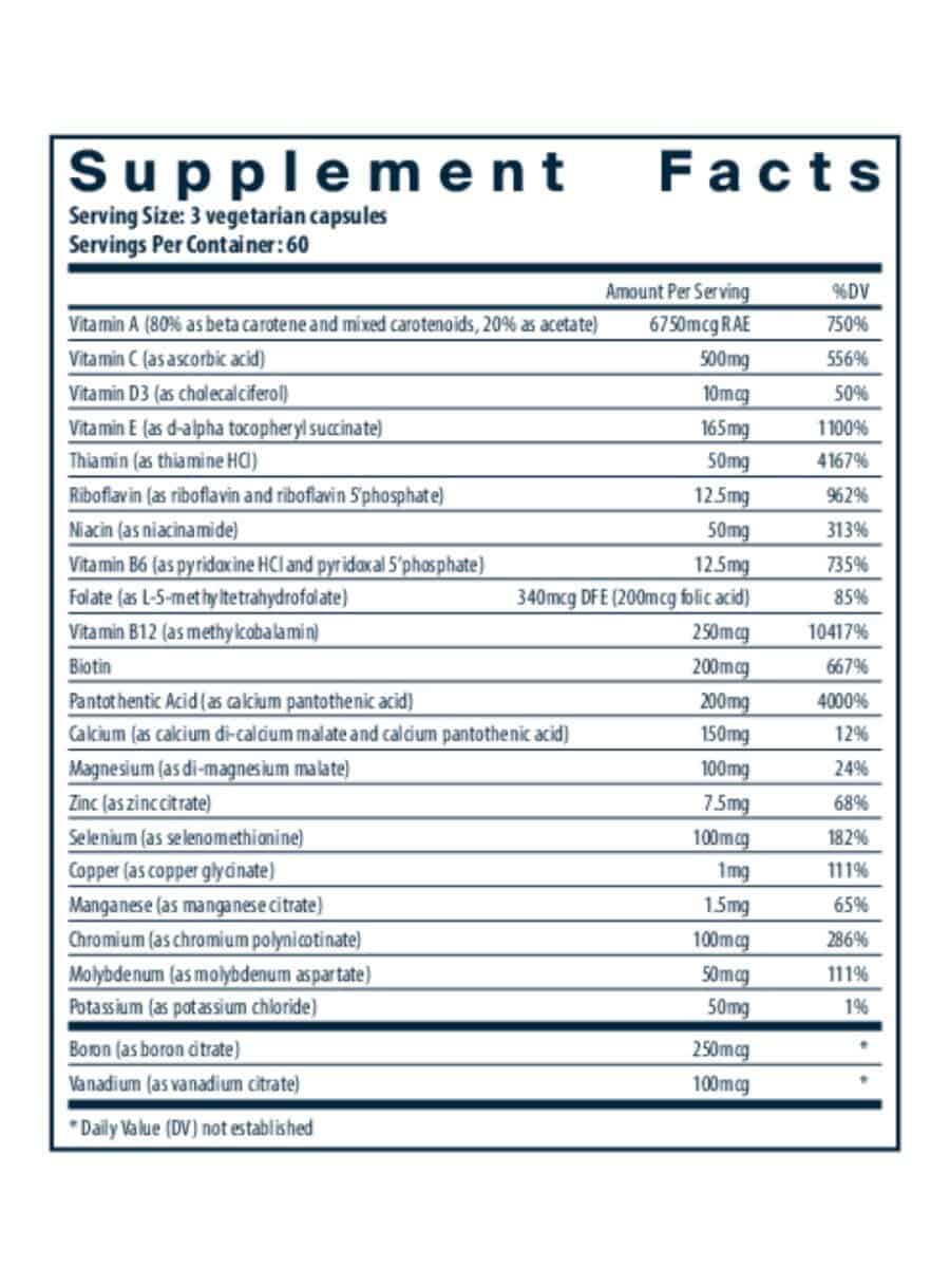 Multi-Nutrients (No Iron or Iodine) — This high potency multivitamin and mineral formula is designed to provide comprehensive nutritional support for various body systems, including bone, skin, cardiovascular, liver, and immune health. It features premium ingredients for optimal absorption, including folate as Metafolin® L-5-MTHF and Vitamin D3, along with potent antioxidants and mineral amino acid chelates. The vegetarian capsules are easy to digest and well tolerated by most individuals.