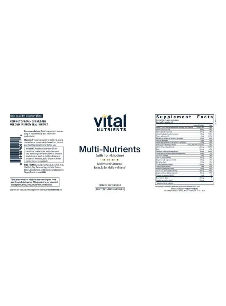 Multi-Nutrients w/Iron and Iodine — This high potency multi-vitamin/mineral and trace element formula provides essential nutrients for overall health, including support for bone, skin, cardiovascular, liver, and immune systems. With premium ingredients like folate as Metafolin® L-5-MTHF and Vitamin D3, this vegetarian formula ensures optimal absorption and physiological activity.