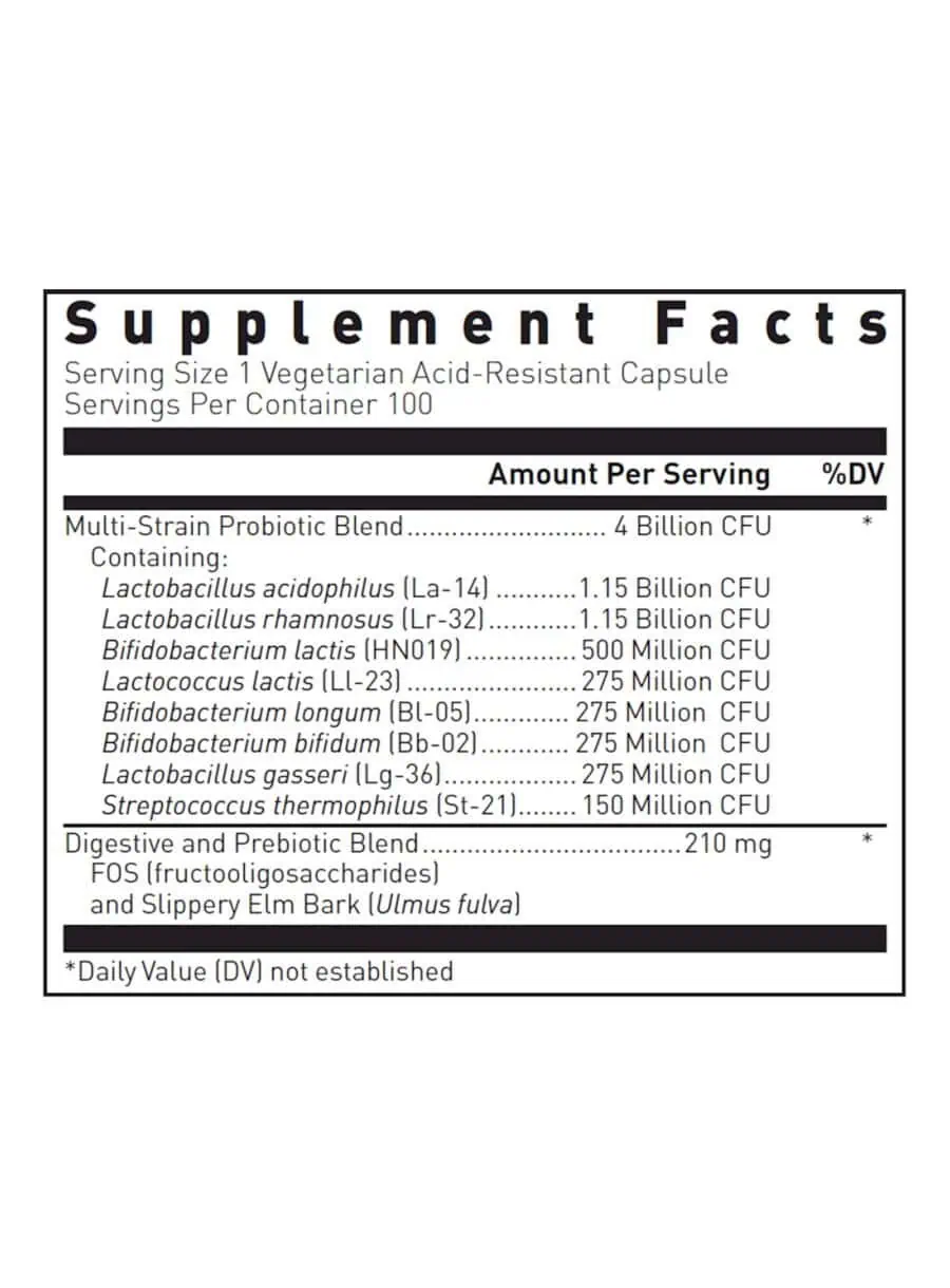 Multi-Probiotic® 4 Billion — This supplement provides 4 billion CFUs of probiotic strains from the lactobacillus and bifidobacterium genera, combined with prebiotic fructooligosaccharides in each acid-resistant capsule. These capsules are designed to bypass the stomach and dissolve in the small intestine, ensuring targeted release in the intestinal tract.