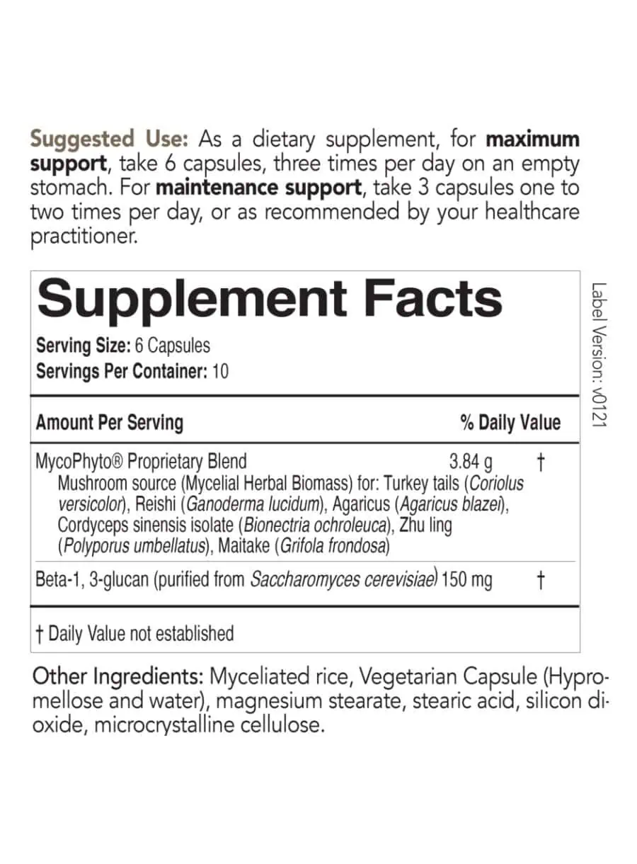 MycoPhyto Complex — This specialized formula features six potent varieties of mushrooms, organically grown on a proprietary matrix of immune-supporting herbs and organic rice. The active components from both the herbs and mushrooms work synergistically to support the immune system. The herbs are assimilated into the mushroom mycelium and biologically modified during the growth cycle, enhancing their health benefits, particularly for immune enhancement. The six highly researched medicinal mushrooms in this unique formula include Coriolus, Reishi, Agaricus, Cordyceps, and Polyporus.