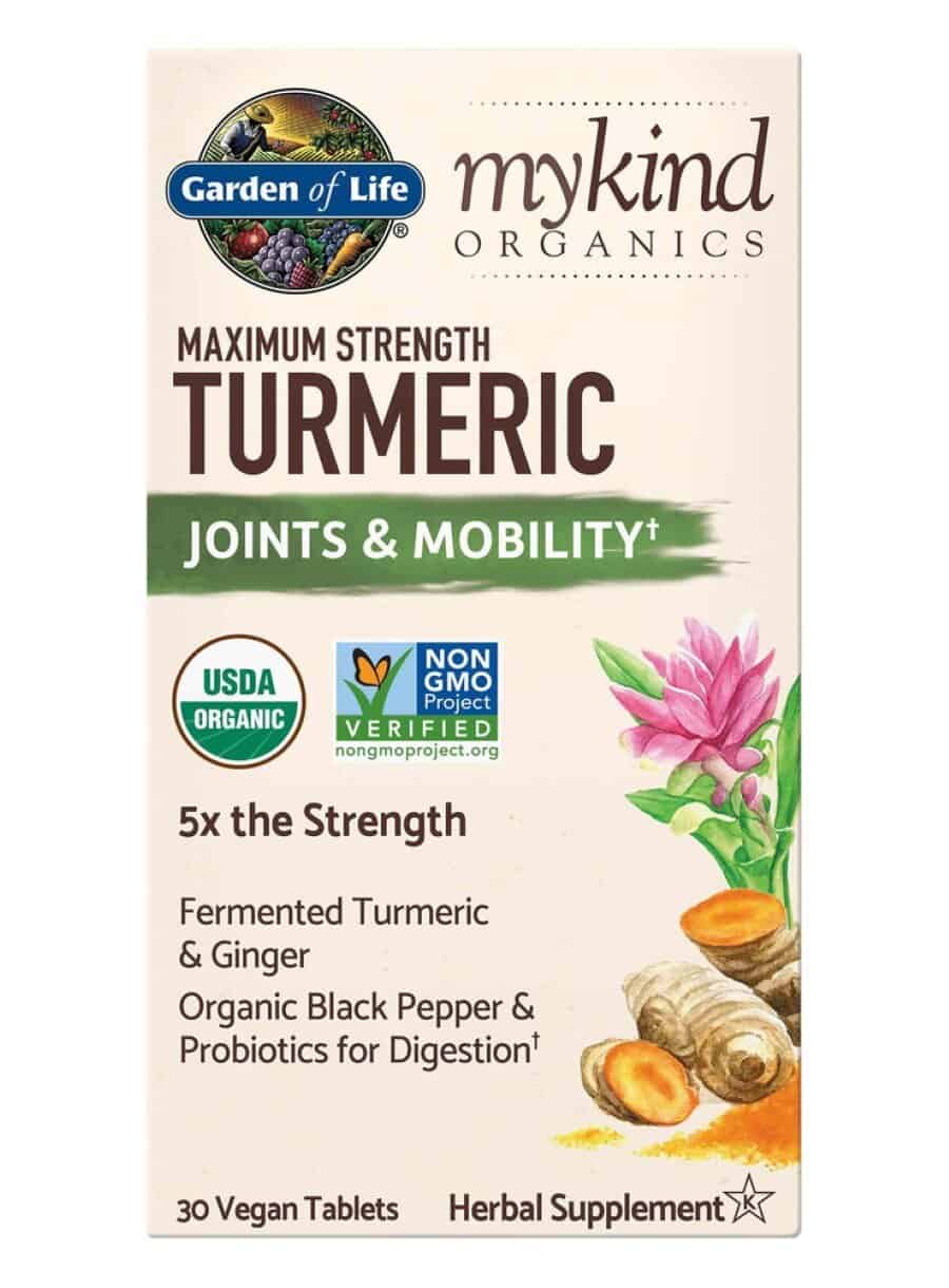 Maximum Strength Turmeric by Garden of Life is designed to support joint health and mobility. This powerful supplement combines fermented turmeric and ginger with probiotics and organic black pepper extract to enhance digestion.