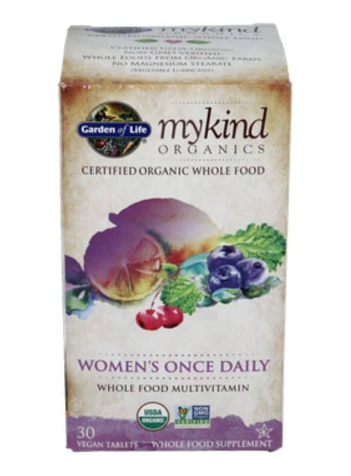 mykind Organics Women’s Once Daily — A whole food multi from real, nutritious foods that’s Certified USDA Organic and Non-GMO Project Verified, specifically formulated in a once-daily dose for the needs of women. Made from over 30 powdered organic fruits, vegetables, and herbs, this multivitamin offers numerous vitamins, including high levels of B vitamins for radiant skin and nails. It provides vitamin B-12 in methylcobalamin form, a highly absorbable, active, natural form of B-12, similar to the B-12 found in the body. Additionally, it delivers vegan D3 from lichen for immune support and 2mg of iron for blood support.