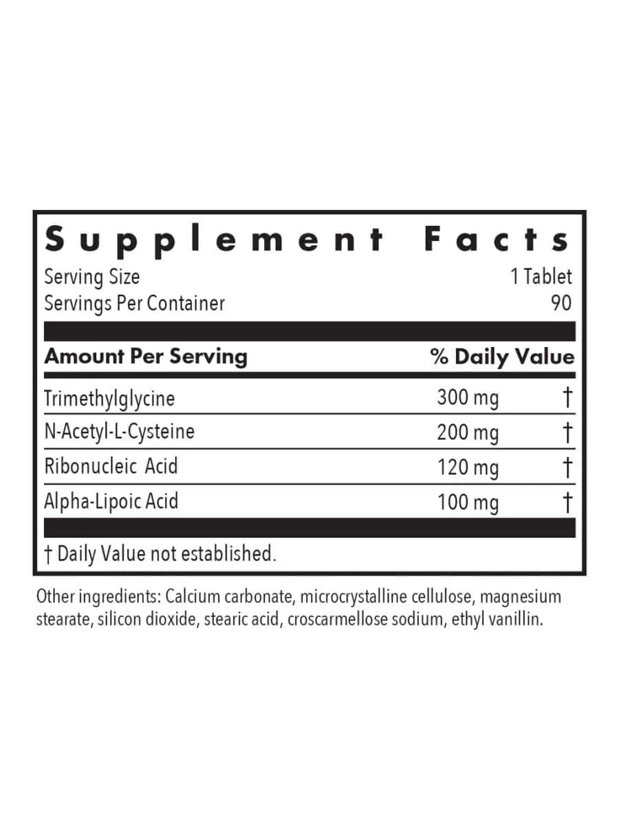 This formula includes Trimethylglycine, N-Acetyl-L-Cysteine, Ribonucleic Acid, and Alpha-Lipoic Acid, which are known for their roles in cellular health and antioxidant support.