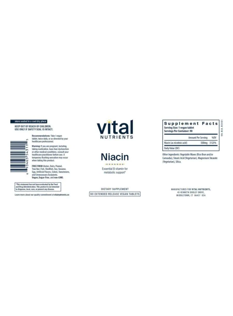 Niacin — Niacin 500mg Extended Release tablets contain Niacin (vitamin B3), a water soluble vitamin with an important role in cellular metabolism. Niacin has a very long clinical use history and has been shown to support lipid metabolism, cholesterol, LDL, lipoprotein (a), and HDL. Niacin has an impressive record of nutritional supportive effects on cholesterol metabolism that are documented in numerous clinical trials. Clinical studies also suggest niacin may support the peripheral circulatory system and healthy fibrinogen production. Vital Nutrients Niacin 500mg Extended Release Tablets contain a time-release matrix that slowly secretes niacin into the body, reducing or eliminating the likelihood of flushing for most people. Clinical trials have demonstrated bioavailability and tolerance of Vital Nutrients extended release Niacin. 1500 mg per day supports lipid metabolism.