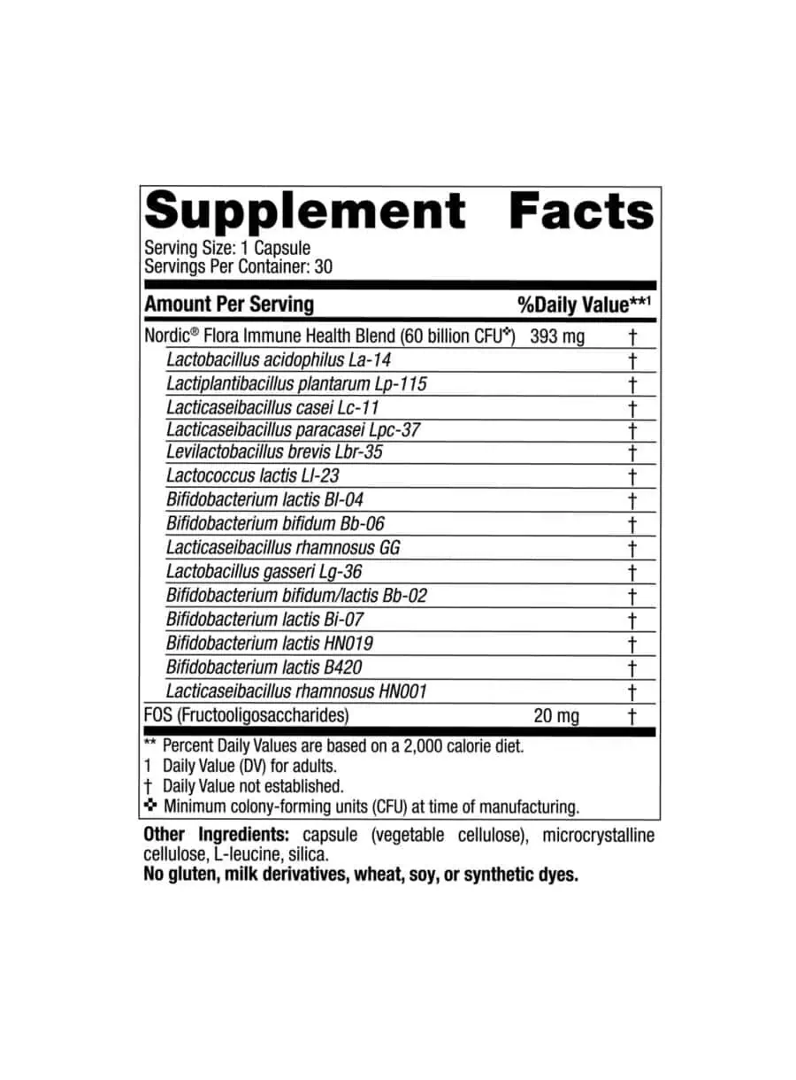 Nordic Flora™ Probiotic Immune Health is a blend of fifteen probiotic strains with 60 billion cultures to support respiratory wellness and healthy immune response. Additionally, this formula provides prebiotic FOS to promote probiotic viability and support beneficial microbes naturally present in the gut. Taken daily, this probiotic supports the body’s natural immune mechanisms and a healthy microbiome.