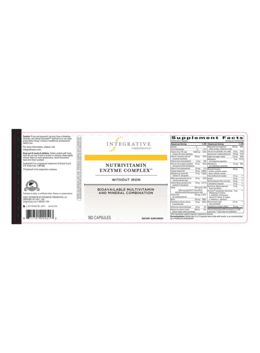 NutriVitamin Enzyme Complex multi formula without iron is a comprehensive multivitamin and mineral supplement with microbial enzymes and antioxidant support (vitamin C, E, and selenium) for nutritional maintenance.