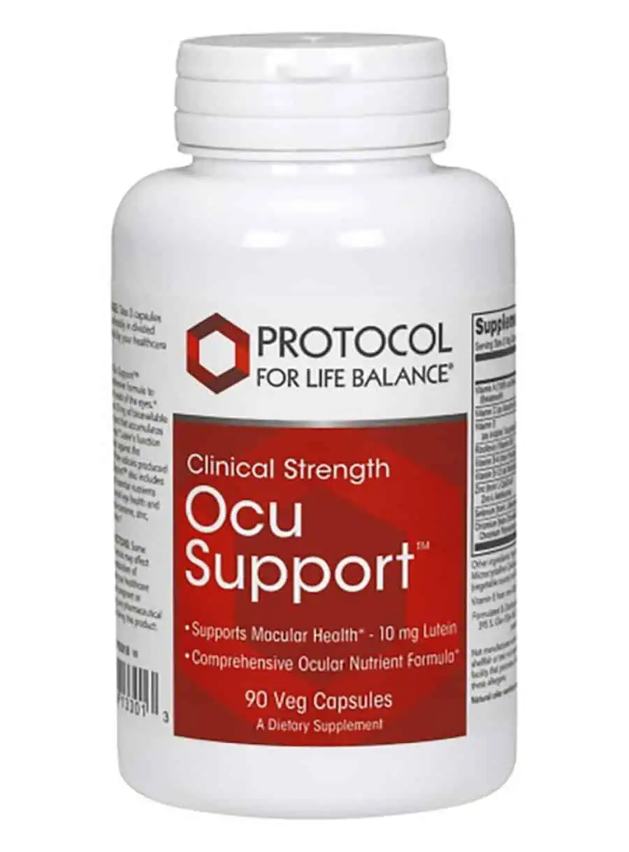 Ocu Support — This clinical strength formula is designed to meet the nutritional needs of the eyes, featuring 10 mg of bioavailable Lutein per serving. Lutein is a critical pigment that accumulates in the retina, helping to protect against free radical damage caused by sunlight. In addition to Lutein, this comprehensive ocular nutrient formula includes essential vitamins and minerals such as Beta-Carotene, Zinc, Taurine, and Zeaxanthin, all known to support overall eye health and function.
