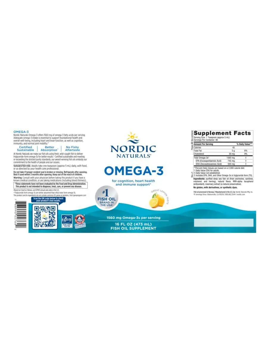 Omega-3 — Nordic Naturals® Omega-3 contains 745 mg EPA and 500 mg DHA in a non-concentrated formula, ensuring a natural balance of its constituents. This supplement is designed to maintain healthy levels of EPA and DHA, supporting heart and brain health, cognition, and immune function. Each serving exceeds the international expert-recommended intake of 500 mg EPA+DHA, making it an excellent choice for overall wellness. Like all Nordic Naturals products, Omega-3 meets stringent international quality standards for fish oil purity and freshness, effectively removing environmental contaminants.