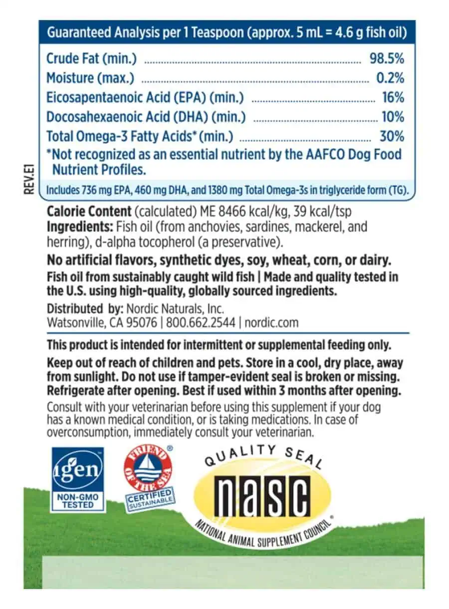 - Eye development and maintenanceNordic Naturals was inspired to launch our Nordic Pet Collection™ to provide dog and cat companions with the same exceptional quality oils we produce for humans, so they too can experience the benefits of our fish oils.Nordic Naturals Omega-3 Pet™ for Medium to Large Breed Dogs is an excellent source of the omega-3 essential fatty acids EPA and DHA. It is an essential supplement to promote optimal pet health and wellness at home. Our pure omega-3 oil is derived exclusively from wild anchovies and sardines from the South Pacific Ocean off the coast of Peru. In 2008, the sustainability of these Peruvian fisheries was ranked as number one in the world.