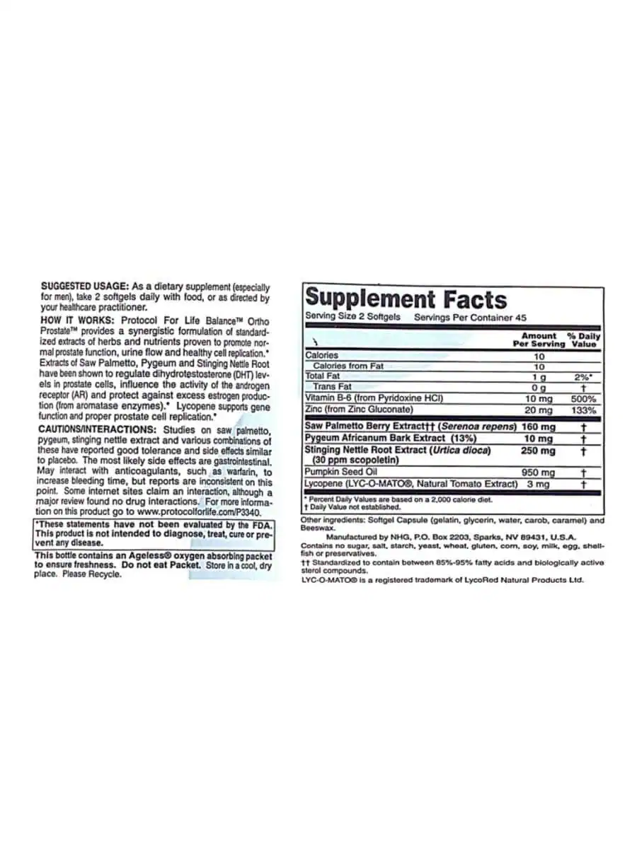 Ortho Prostate — This dietary supplement features a synergistic blend of standardized herbal extracts and nutrients designed to support normal prostate function, enhance urine flow, and promote healthy cell replication. Key ingredients like Saw Palmetto, Pygeum, and Stinging Nettle Root are known to help regulate dihydrotestosterone (DHT) levels, influence androgen receptor activity, and protect against excess estrogen production. Additionally, Lycopene contributes to gene function and proper prostate cell replication.