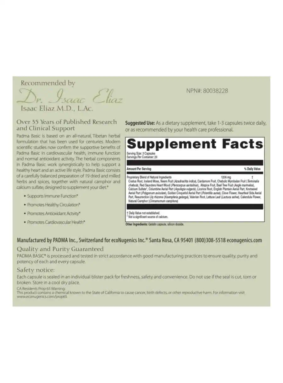 Padma Basic® is an herbal blend based on a traditional Tibetan formula, supported by over 35 years of clinical and laboratory research. This unique and widely researched herbal formula promotes cardiovascular and circulatory health, supports healthy immune function, and provides antioxidant support. It is produced under strict pharmaceutical-grade manufacturing guidelines, ensuring superior purity and potency.
