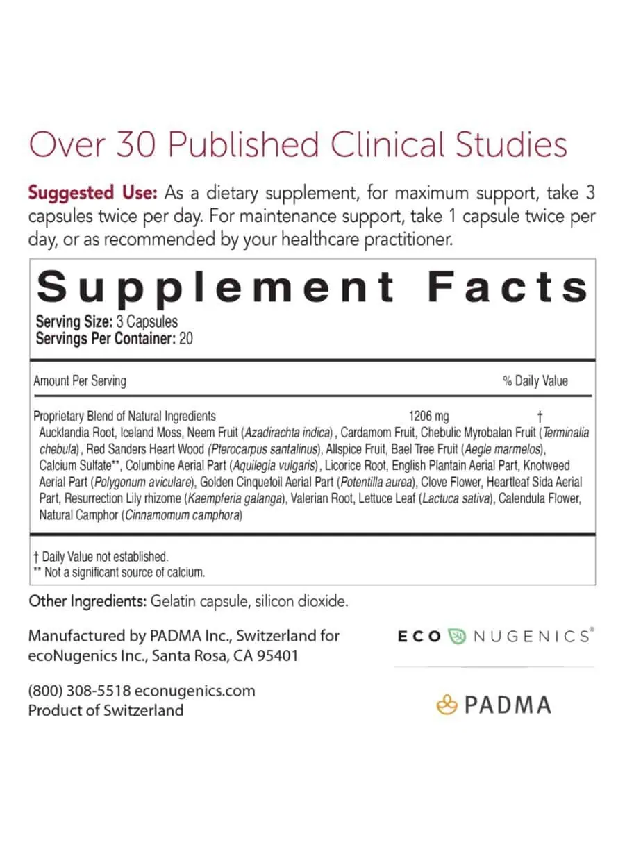 Padma Basic® contains 19 botanical ingredients, including Aucklandia Root, Iceland Moss, and Neem Fruit, which work synergistically to combat free radicals and support cardiovascular function. The formula is rich in active ingredients such as tannins, flavonoids, and essential oils.