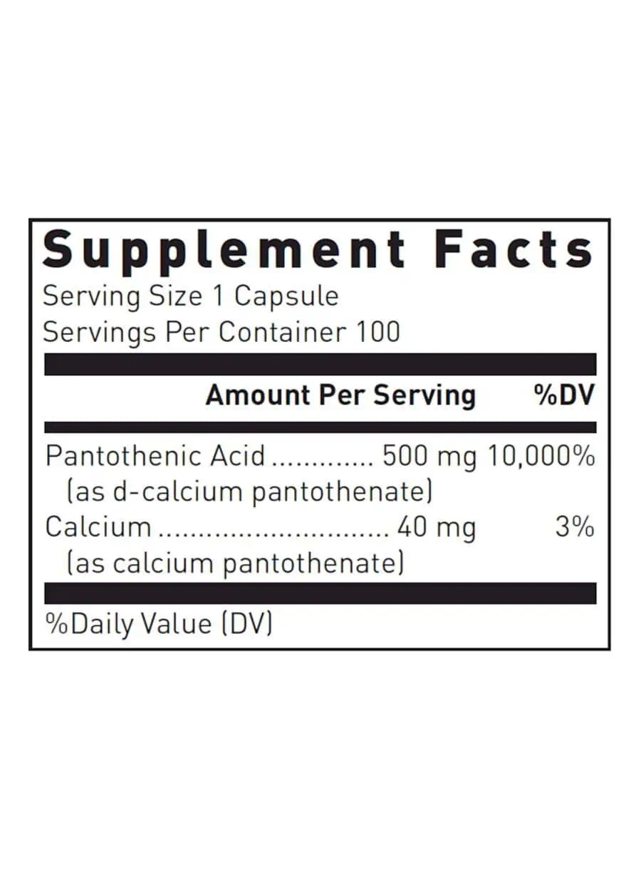 Pantothenic Acid 500mg — This dietary supplement provides 500 mg of pantothenic acid in a convenient capsule form, supporting overall health and wellness. Ideal for adults, it is designed to be taken daily or as directed by a healthcare professional.