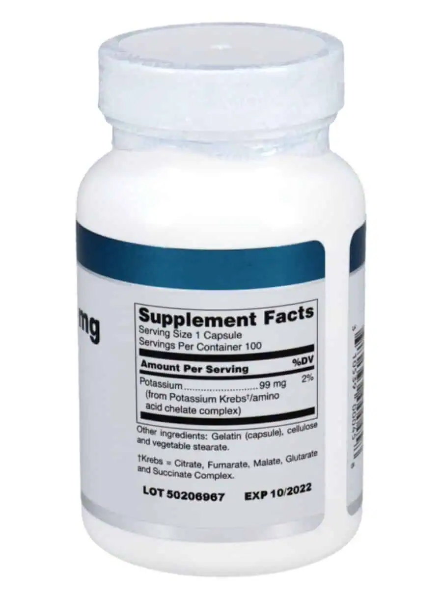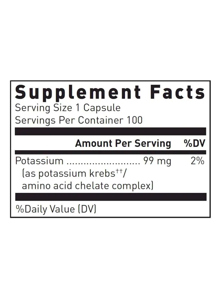 Potassium Chelated — This dietary supplement provides elemental potassium sourced from a potassium chelate complex, designed to support overall health and wellness. Each capsule delivers a precise dose of potassium, making it an excellent choice for adults looking to maintain their potassium levels.