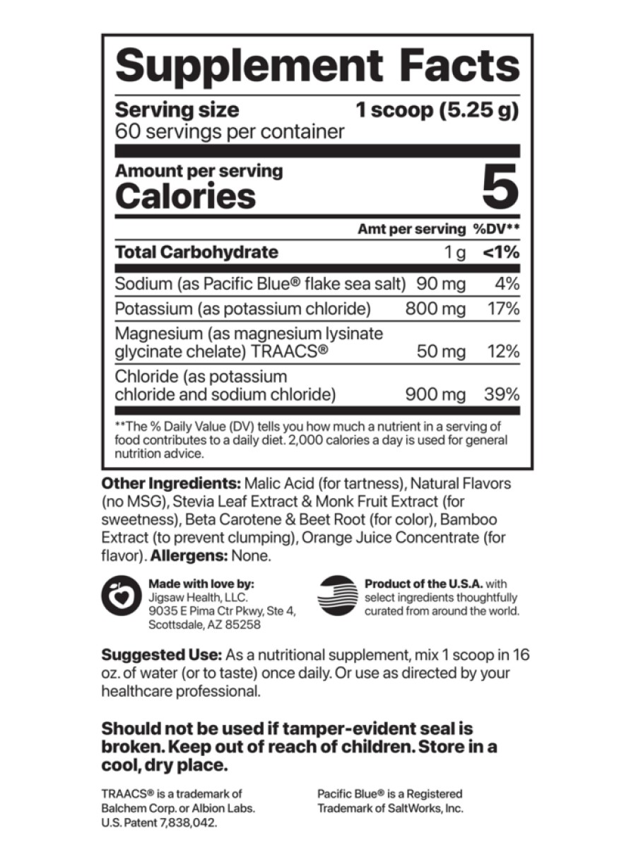 Potassium Cocktail Jar, Orange — This unique blend is designed to support hydration and muscle function, especially during high activity days. With a combination of Potassium and Magnesium, it helps prevent muscle cramps and supports overall electrolyte balance. The addition of Pacific Blue® flake sea salt provides essential trace minerals that regular table salt lacks, making it a superior choice for those looking to maintain optimal health without added sugars.