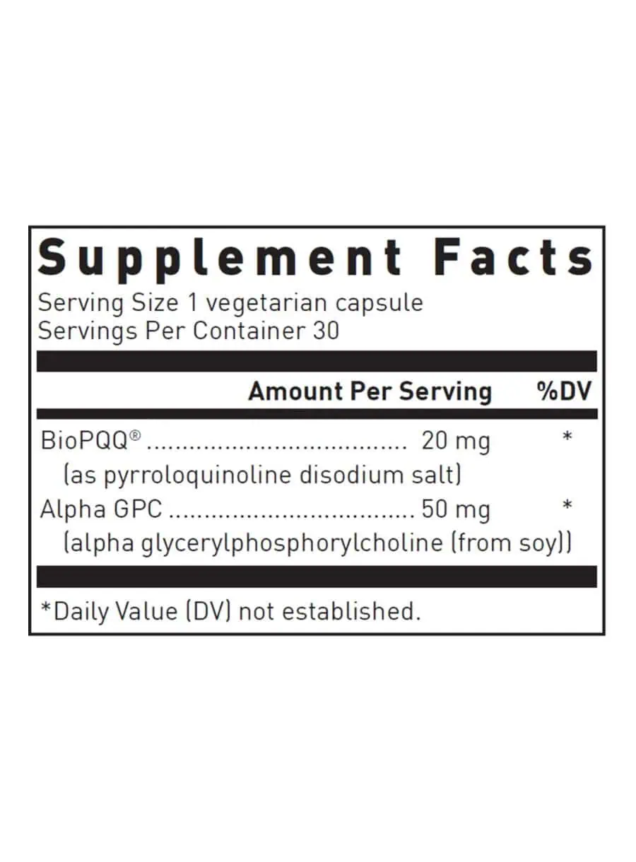 PQQ Plus — This supplement provides 20 mg of pyrroloquinoline quinone (PQQ), a compound often regarded as a newly discovered vitamin, along with 50 mg of alpha glycerylphosphoryl choline (alpha GPC) in each vegetarian capsule. Designed to support neurological health, this formula is ideal for adults seeking cognitive enhancement and overall brain function support.