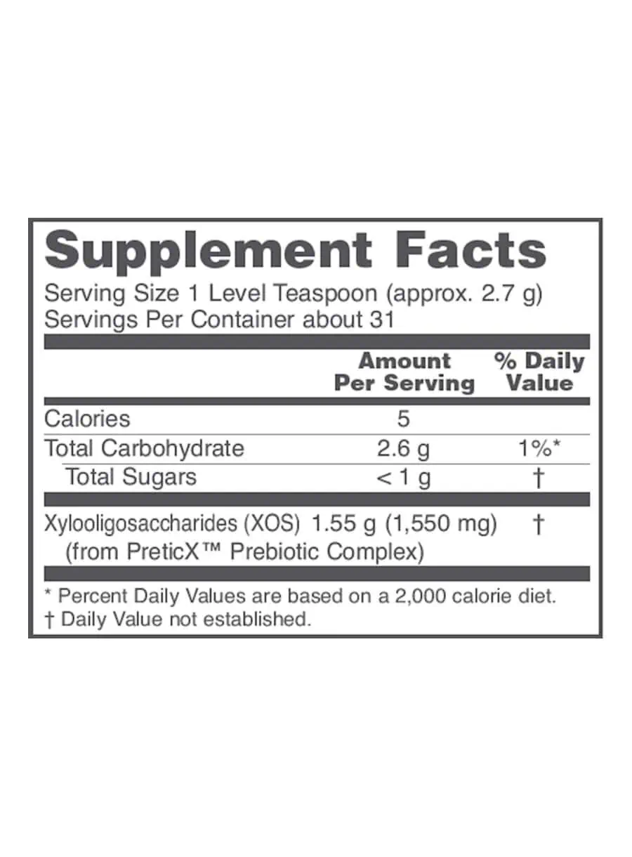 Prebiotic Powder XOS features PreticX™, a prebiotic complex comprised of xylooligosaccharides (XOS). XOS are selective, bifidogenic prebiotics shown to increase the amount of healthful Bifidobacteria in the GI tract of healthy individuals, which is particularly beneficial with aging.* When added to the diet, Prebiotic Powder XOS helps to maintain healthy flora balance, nourishes the intestinal lining, and promotes regularity without additional bloating or flatulence.* Consider adding this product to your probiotic supplements. PreticX™ is a trademark of AIDP, Inc. This product is sold by weight not volume.